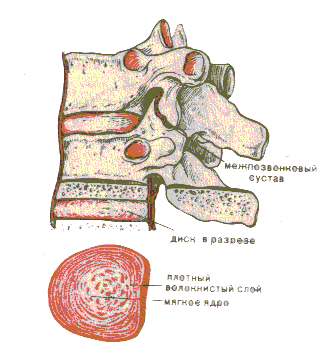 Между позвонками находятся межпозвонковые диски, которые состоят из фиброзных колец и студенистого ядра. Эластичная консистенция диска позволяет ему менять форму. Способность диска принимать на себя и распределять давление между позвонками позволяет ему играть роль амортизатора и дает возможность позвоночнику сгибаться.