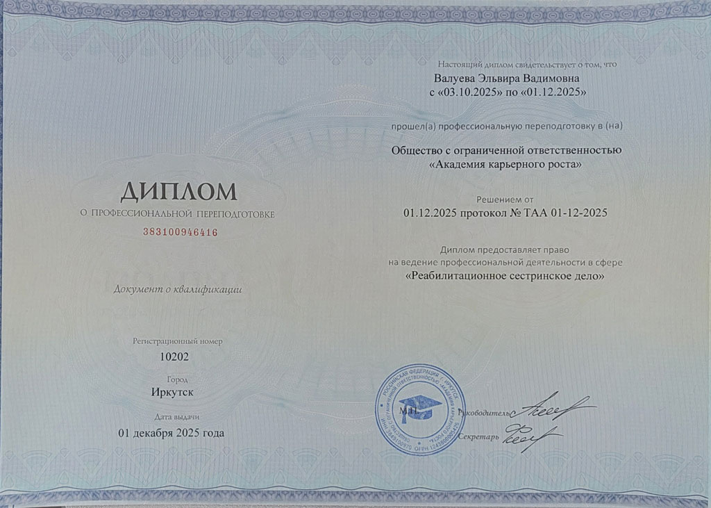 К Валуевой Эльвире Вадимовне я обратился в ноябре прошлого, 2023 года с проблемой, которая называется шейно-плечевой синдром. Я человек возрастной, имеющий массу всяких хронический заболеваний. Обо всем расспросила, выслушала. Составила программу лечебных занятий соответствующую моему возрасту и тогдашнему состоянию. Поставила задачу, с улыбкой на лице. И дело двинулось, несмотря, что я был слаб и руки мои меня плохо слушались. С тех пор прошел три курса ЛФК. Боли ушли, функциональность левой руки восстановилась, мышцы, ослабленные болезнью, окрепли. Сейчас продолжаю заниматься в зале ЛФК самостоятельно, но Эльвира Вадимовна, как главный методист, регулярно следит за выполнением общей программы и отдельных упражнений, ненавязчиво дает советы и указания. Мастер своего дела. Общаться с ней одно удовольствие.