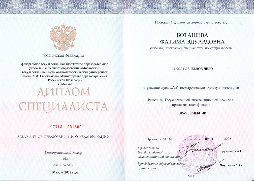 • 2022 - Московский государственный медико-стоматологический университет имени А.И. Евдокимова, г. Москва, врач лечебник