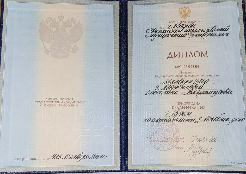 • 2000 - Российский национальный исследовательский медицинский университет имени Н.И. Пирогова, Лечебное дело.