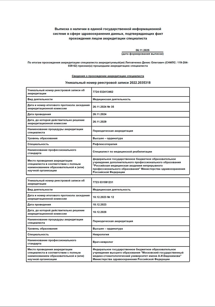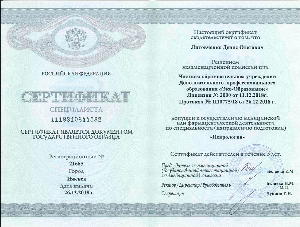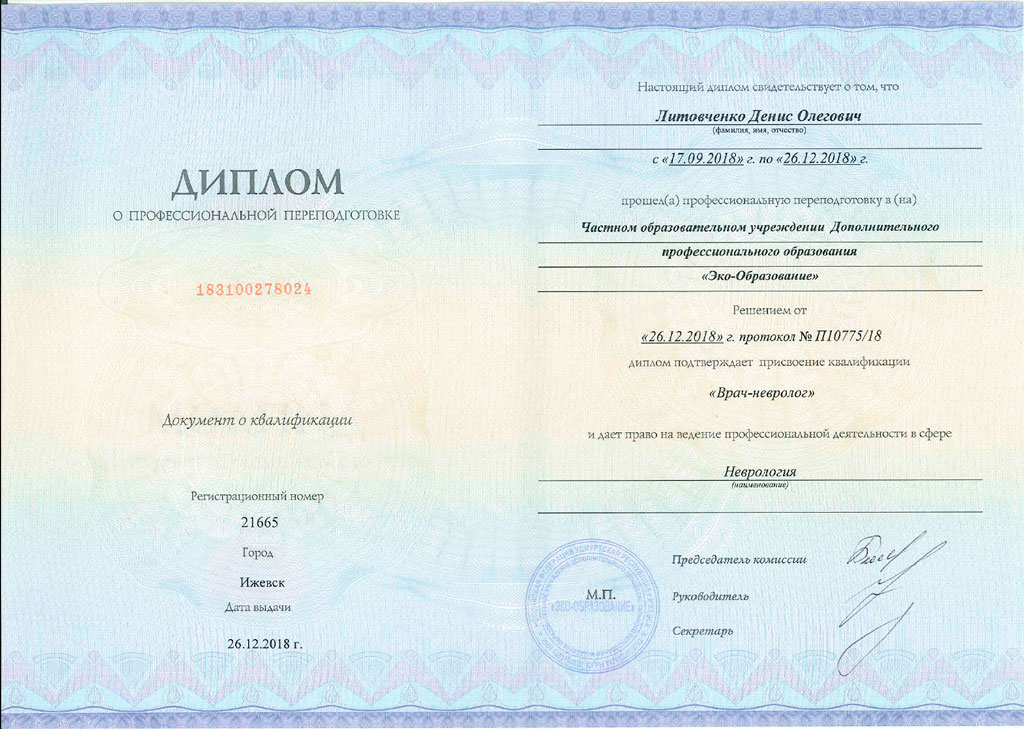 • 2018 - Повышение квалификации «Неврология», Учебный центр «Эко-образование»
