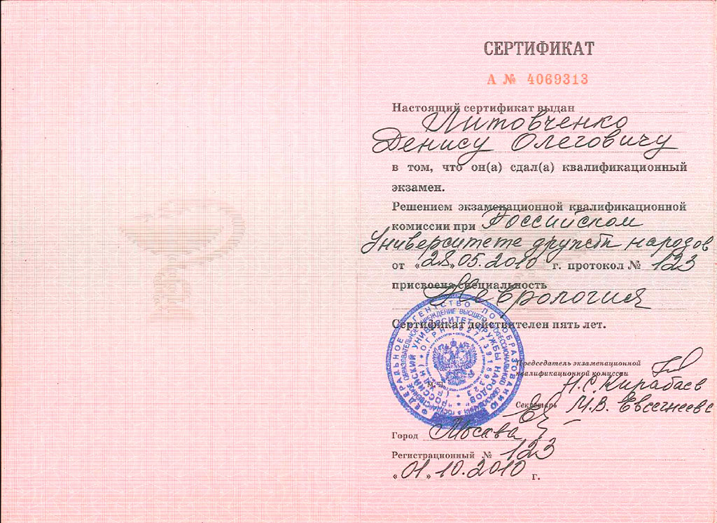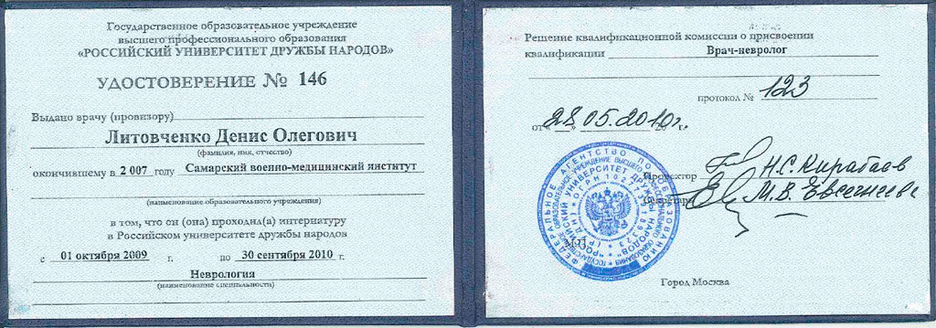 • 2010 - Интернатура «Неврология», Российский университет дружбы народов им. П. Лумумбы (РУДН)