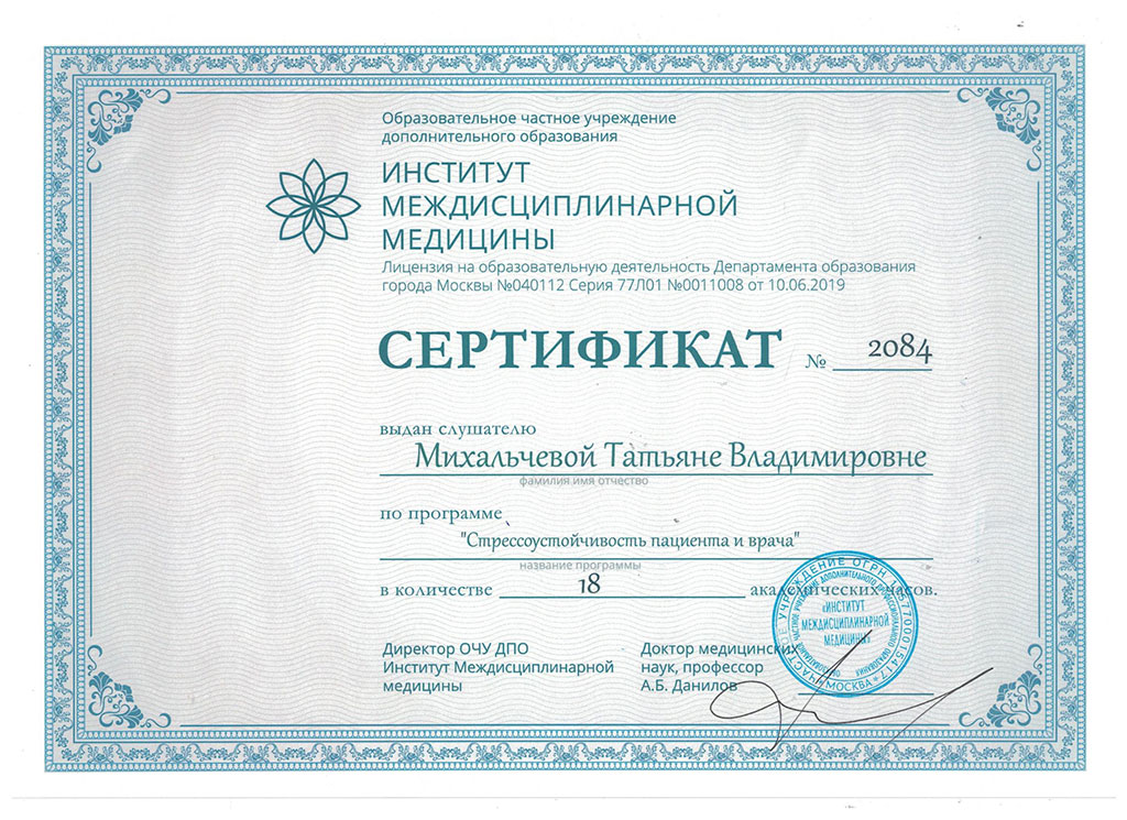 Я сделала МРТ и показала Татьяне Владимировне. Она направила меня на УЗИ и еще одно МРТ. После чего и установила точный диагноз: транзиторная ишемическая атака. Через день хожу на массаж, иглоукалывание, посещаю остеопата. Через пару дней стало значительно легче, но терапия прописана на 2 недели. Михальчева располагает к себе, общается с пациентами хорошо.