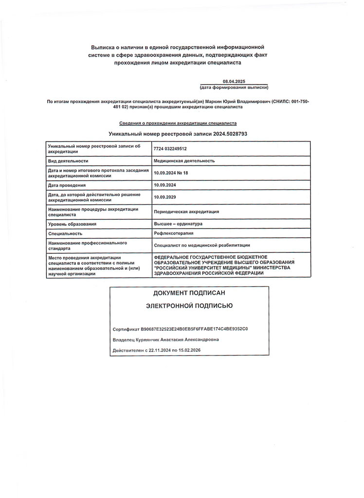 - 2019 – Российская академия медико-социальной реабилитации — Рефлексотерапия