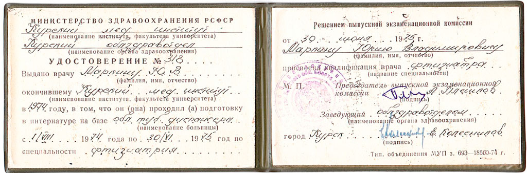 - 1975 – Курский государственный медицинский университет — Фтизиатрия, г. Курск