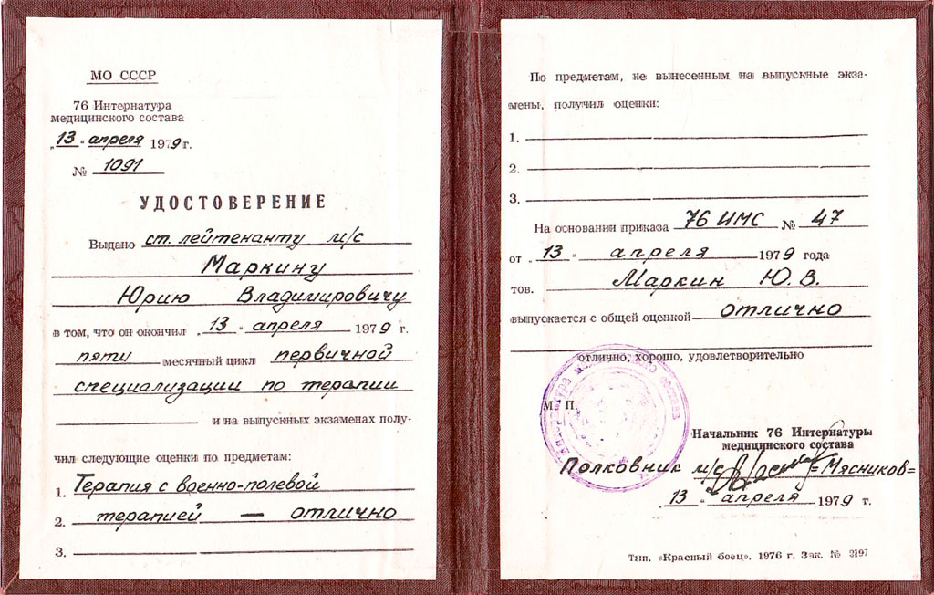 - 1979 – Курский государственный медицинский университет — Терапия, г. Курск