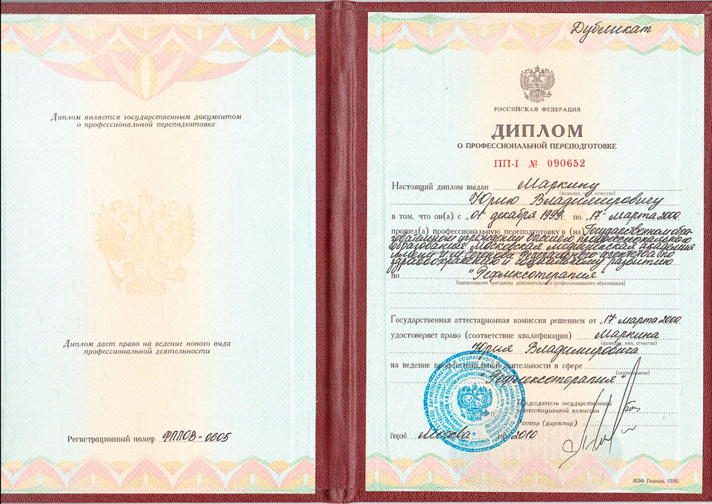 - 2000 – Первый Московский государственный медицинский университет им. И.М. Сеченова — Рефлексотерапия, г. Москва