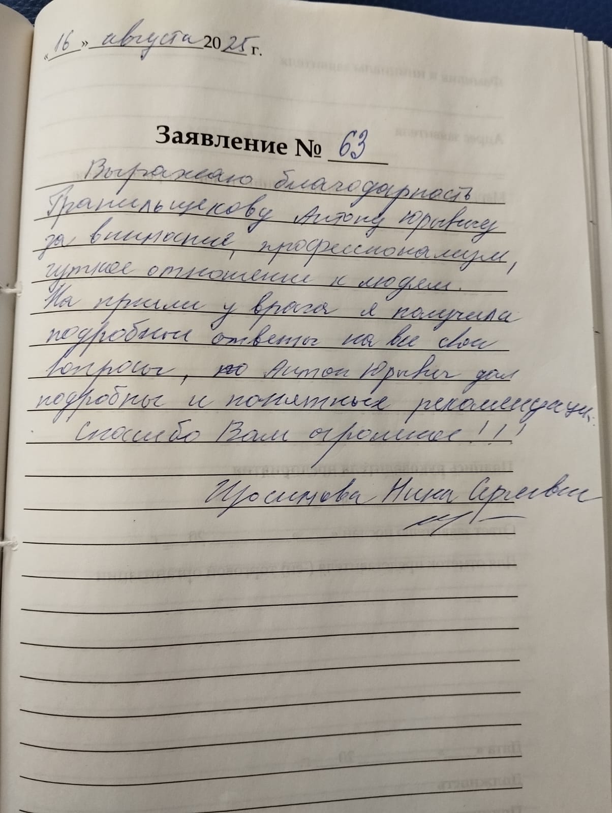 Очень благодарна Антону Юрьевичу за профессионализм и внимание. Прекрасный доктор, добрый и отзывчивый человек. Очень рекомендую