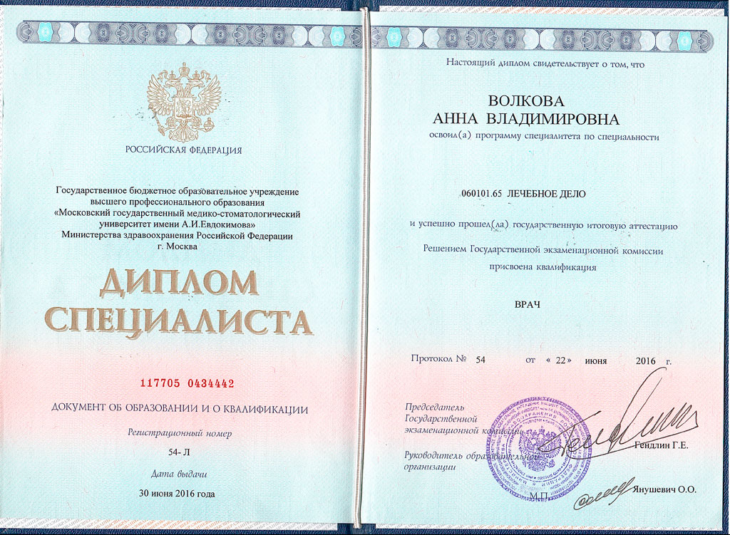 • 2016 – Московский государственный медико-стоматологический университет имени А.И. Евдокимова «Лечебное дело»