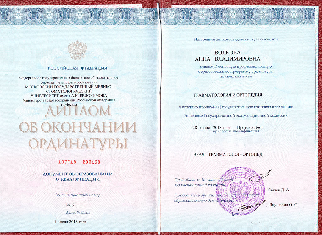 • 2018 – Московский государственный медико-стоматологический университет имени А.И. Евдокимова «Травматология и ортопедия»