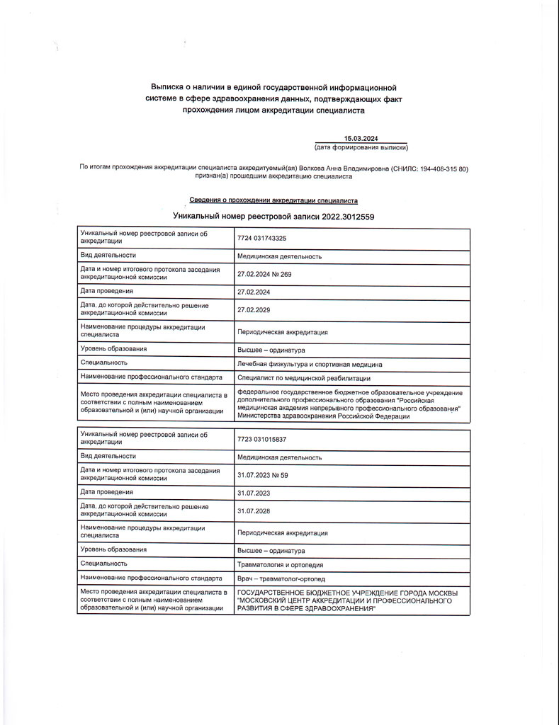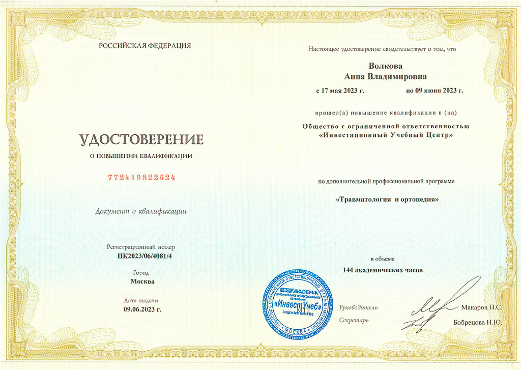• 2023 – ООО «Инвестиционный учебный центр», периодическая аккредитация по специальности «Травматология и ортопедия»