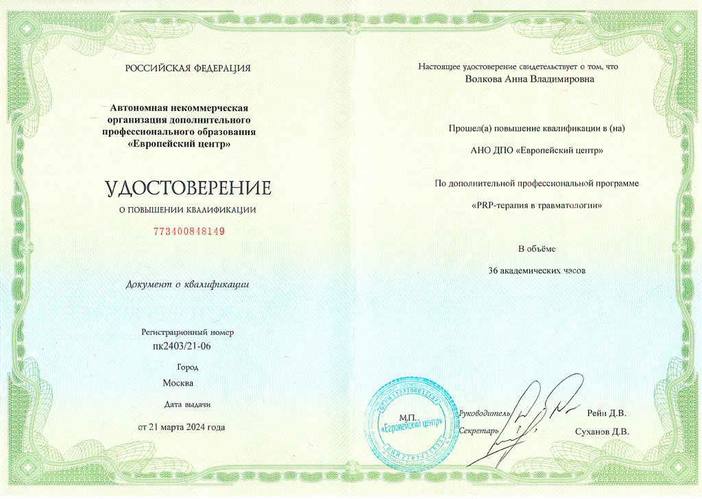 • 2024 – АНО ДПО «Европейский центр», периодическая аккредитация по программе «РRР-терапия в травматологии»